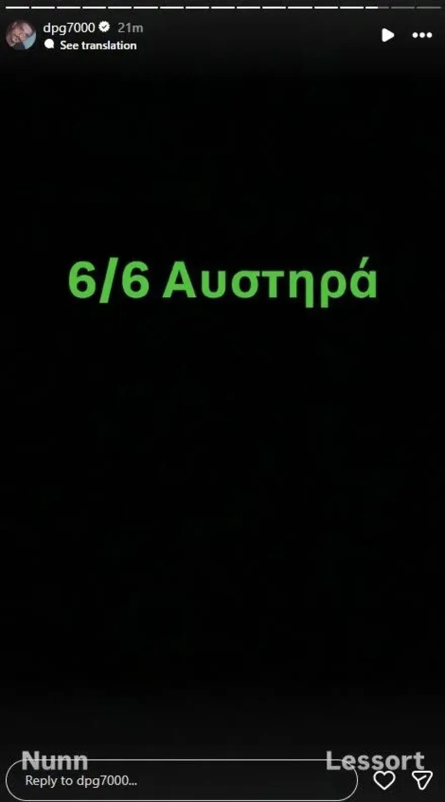Σε άλλο story, έστειλε μήνυμα ενόψει της συνέχειας της σεζόν. «6/6 αυστηρά» έγραψε στα social media, θέτοντας ως στόχο τις έξι νίκες στα εναπομείναντα παιχνίδια.