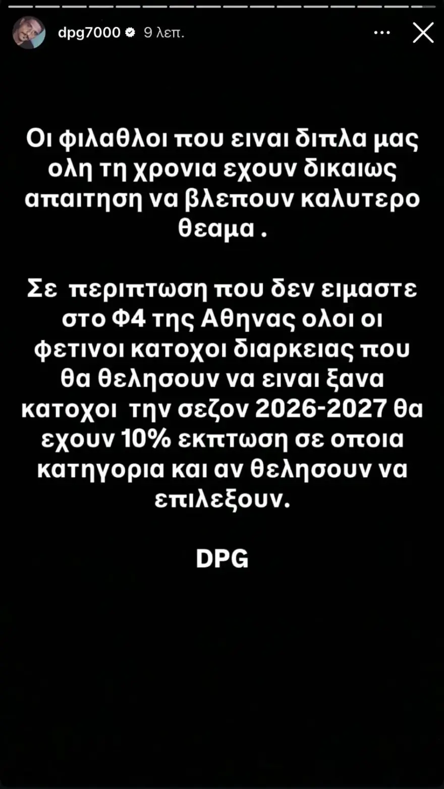 «Οι φίλαθλοι που είναι δίπλα μας όλη τη χρόνια έχουν δικαίως απαίτηση να βλέπουν καλύτερο. Σε περίπτωση που δεν είμαστε στο Final Four της Αθήνας όλοι οι φετινοί κάτοχοι διαρκείας που θα θελήσουν τα είναι ξανά κάτοχοι τη σεζόν 2026-2027 θα έχουν 10% έκπτωση σε όποια κατηγορία και αν θελήσουν να επιλέξουν» έγραψε.