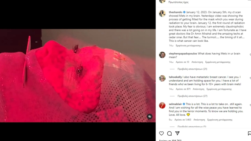 Σημειώνεται ότι διαγνώστηκε με καρκίνο του μαστού στο στάδιο 4 τον Φεβρουάριο του 2020. Η 52χρονη ηθοποιός συγκλονίζει με μία νέα ανάρτηση στα μέσα κοινωνικής δικτύωσης ανακοινώνοντας ότι η αξονική τομογραφία που πραγματοποιήθηκε στις 5 Ιανουαρίου έδειξε ότι είχε μετάσταση στον εγκέφαλο.