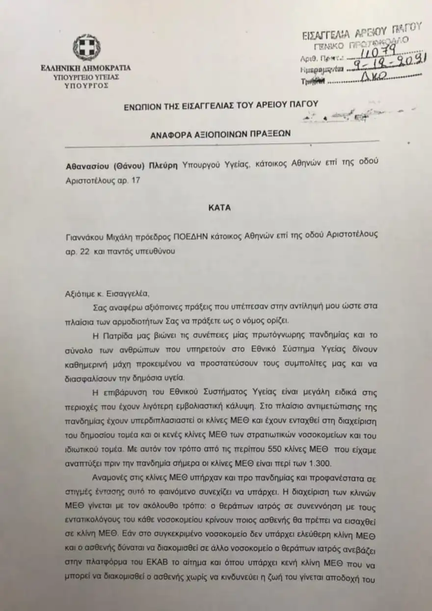 Ο Υπουργός Υγείας Θάνος Πλεύρης κατέθεσε ενώπιον του Εισαγγελέως του Αρείου Πάγου αναφορά αξιόποινων πράξεων κατά του προέδρου της ΠΟΕΔΗΝ Μιχάλη Γιαννάκου και παντός υπευθύνου που διακινεί ψευδείς και συκοφαντικές ειδήσεις για δήθεν ύπαρξη κλινών ΜΕΘ που κρατούνται για επιλεγμένα πρόσωπα και δεν διατίθενται στους ασθενείς. Νωρίτερα, υπήρξε και η παρέμβαση από την προϊσταμένη της Εισαγγελίας Πρωτοδικών της Αθήνας.
