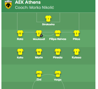 Η ενδεκάδα της ΑΕΚ αποτελείται από τους Στρακόσα, Ρότα, Μουκουντί, Ρέλβας, Πήλιο, Μαρίν, Πινέδα, Κουτέσα, Κοϊτά, Ζίνι, Βάργκα.