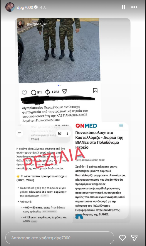 Συγκεκριμένα, με στόρι του απάντησε στους «ερυθρόλευκους» που τον κάλεσαν να αναρτήσει φωτογραφία από τη στρατιωτική του θητεία το απόγευμα της Τρίτης 31/3.