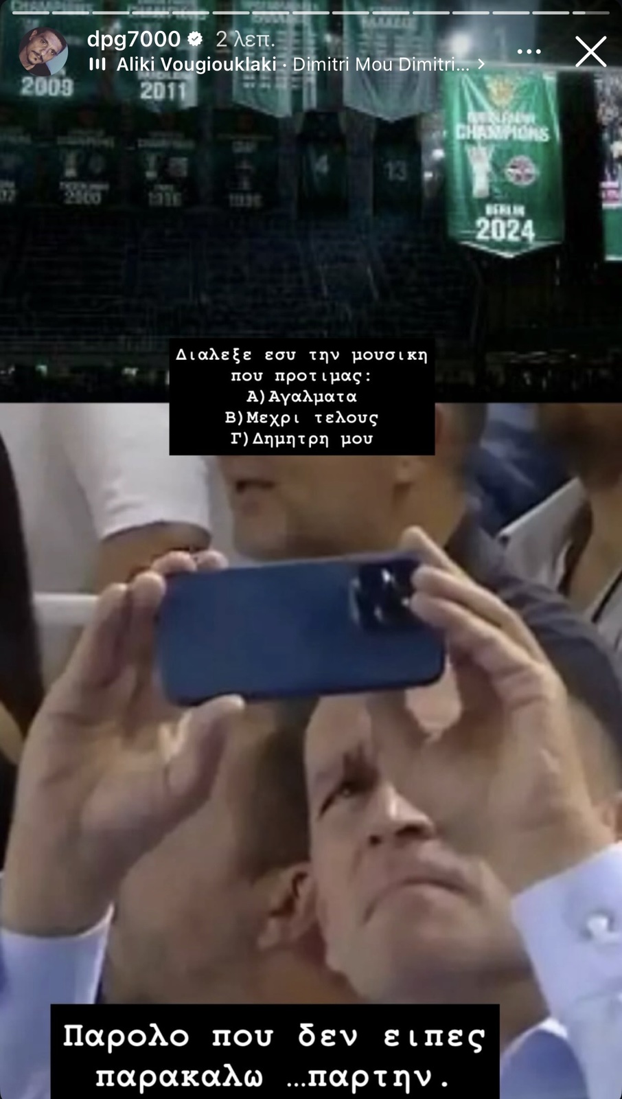 Ο Δημήτρης Γιαννακόπουλος ανήρτησε μια φωτογραφία με τα λάβαρα του συλλόγου στο T-Center και τον Παναγιώτη Αγγελόπουλο να τα φωτογραφίζει, ενώ στη συνέχεια με άλλο στόρι του στάθηκε στα όσα έχει κάνει για την Ελλάδα γράφοντας «ρεζίλια».