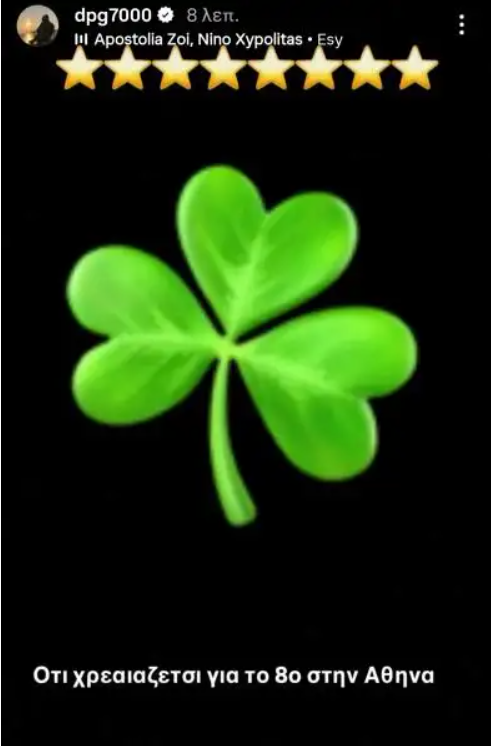 Σε μία από τις πολλές καθημερινές αναρτήσεις που ανεβάζει ο μεγαλομέτοχος της ΚΑΕ Παναθηναϊκός σχετικά για την αγαπημένη του ομάδα, αυτη τη φορά μια μαύρη οθόνη με 8 αστέρια και ένα μεγάλο τριφύλλι τράβηξε τα βλέμματα, ενώ από κάτω αναγράφεται: «Ό,τι χρειάζεται για το 8ο στην Αθήνα»