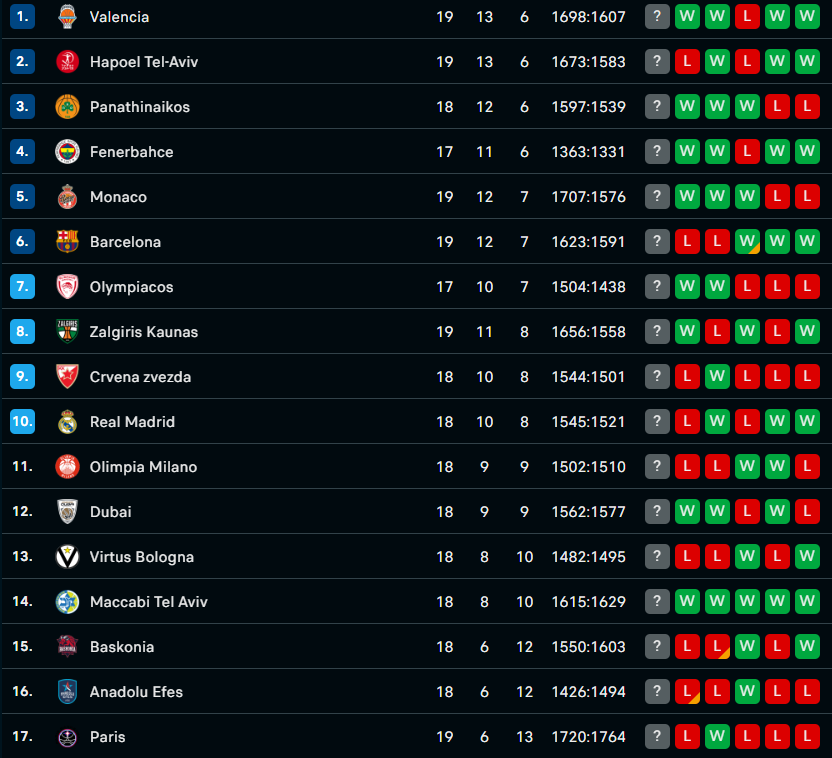 Σπουδαία ματς σηματοδότησαν την λήξη του πρώτου σκέλους της 19ης αγωνιστικής της Euroleague, με την Ζαλγκίρις να επικρατεί της Χάποελ Τελ Αβίβ με 80-93 και την ομάδα του Βασίλη Σπανούλη να παίρνει μεγάλο διπλό στην Βαρκελώνη με 90-74.