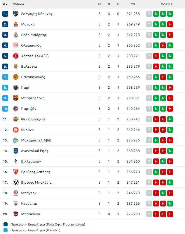 Euroleague: Η θέση των Ολυμπιακού και Παναθηναϊκού AKTOR μετά την 3η αγωνιστική – Μόνη πρώτη η Ζαλγκίρις
