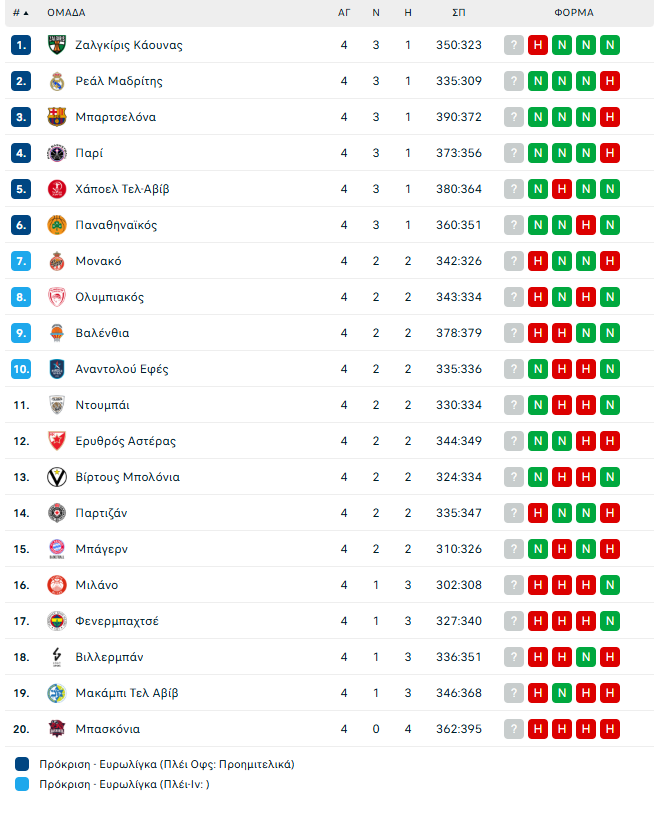Euroleague: Η βαθμολογία μετά το φινάλε της 4ης αγωνιστικής – Το πρόγραμμα για Παναθηναϊκό AKTOR και Ολυμπιακό