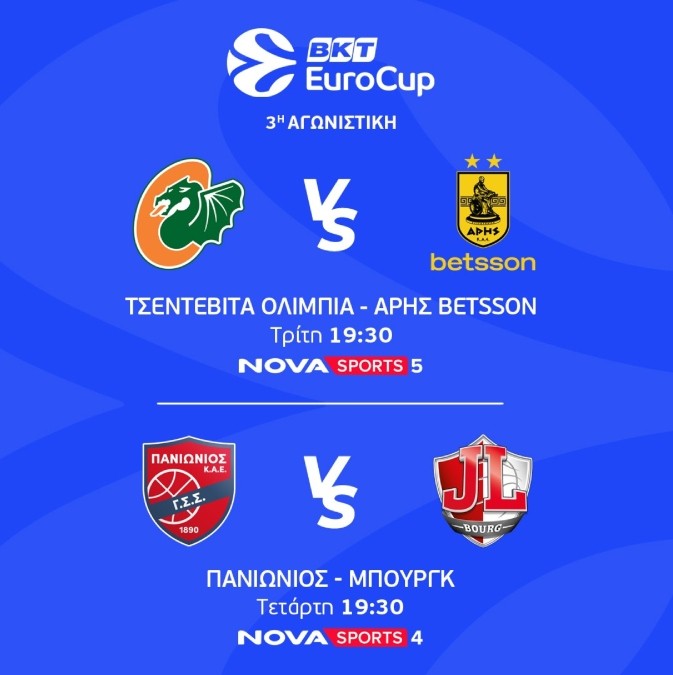 Το EuroCupσυνεχίζεται με αμείωτο ενδιαφέρονκαι τη διπλή ελληνική εκπροσώπηση, και για την 3η αγωνιστική οι συνδρομητές θα απολαύσουν Τσεντεβίτα Ολίμπια-Άρης Betsson (14/10, 19:30) και Πανιώνιος – Μπουργκ (15/10, 19:30).