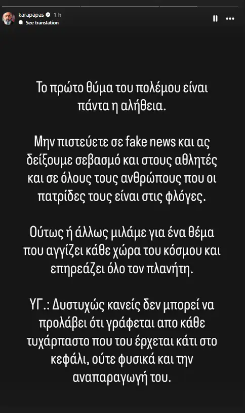 Καραπαπάς: «Μην πιστεύετε σε fake news, ας δείξουμε σεβασμό στους αθλητές που οι πατρίδες τους είναι στις φλόγες»