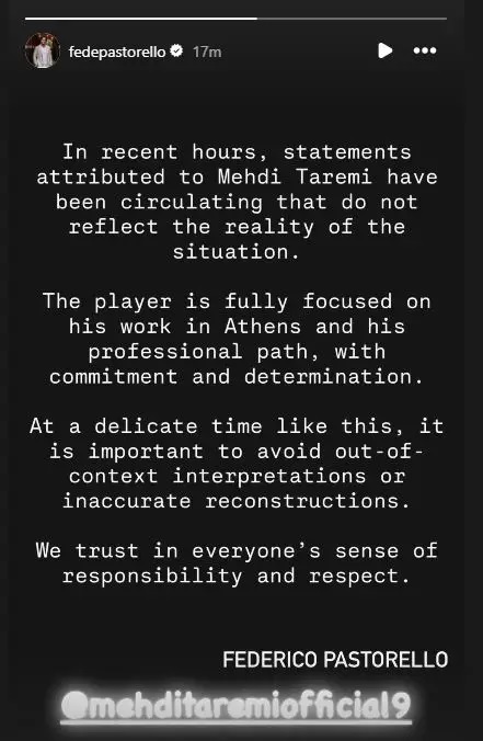 Ο παίκτης είναι πλήρως συγκεντρωμένος στη δουλειά του στην Αθήνα και στο επαγγελματικό του μονοπάτι, με αφοσίωση και αποφασιστικότητα. Σε μία λεπτή στιγμή όπως αυτή, είναι σημαντικό να αποφεύγονται οι ερμηνείες εκτός πλαισίου ή οι ανακρίβειες».