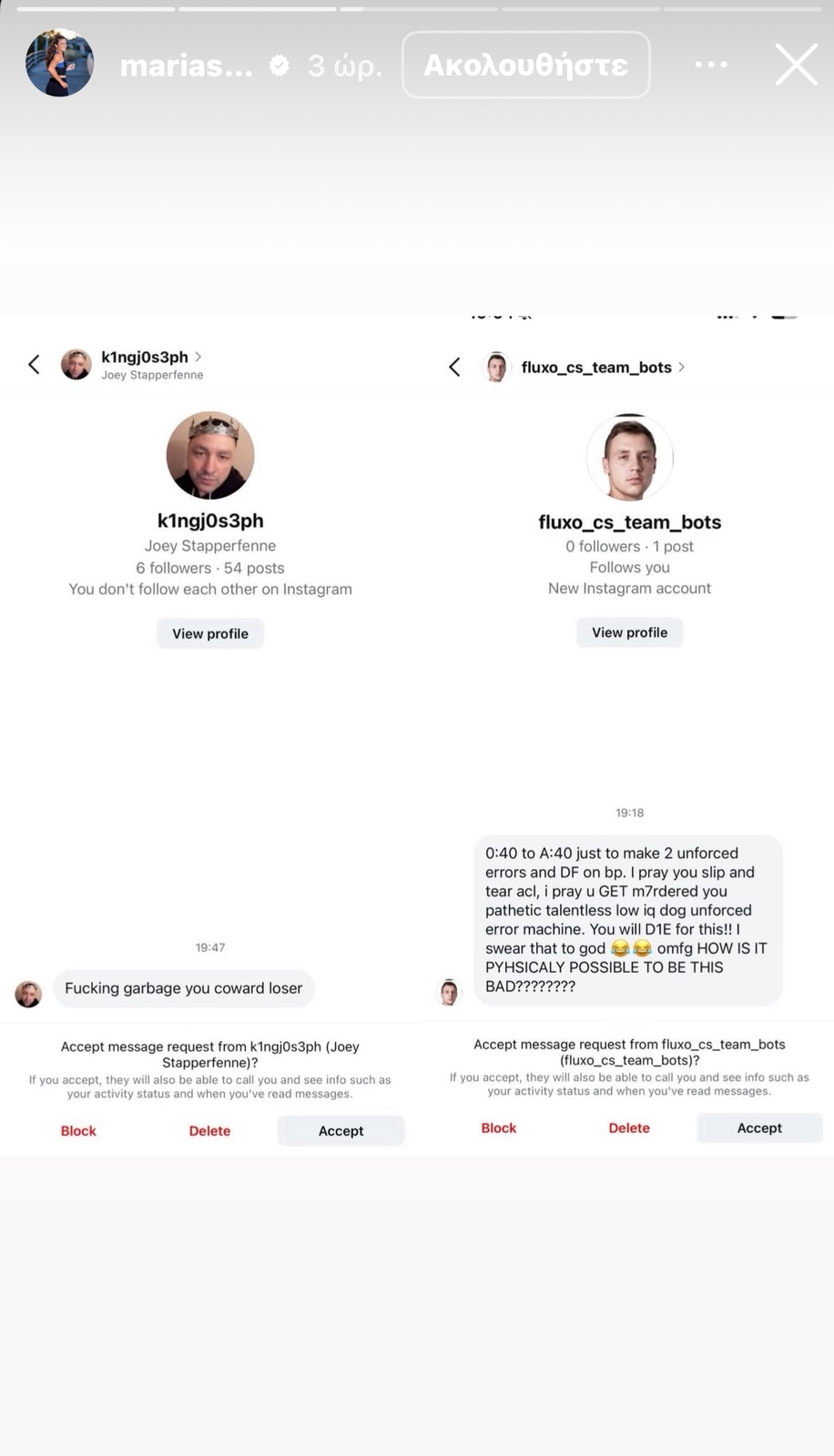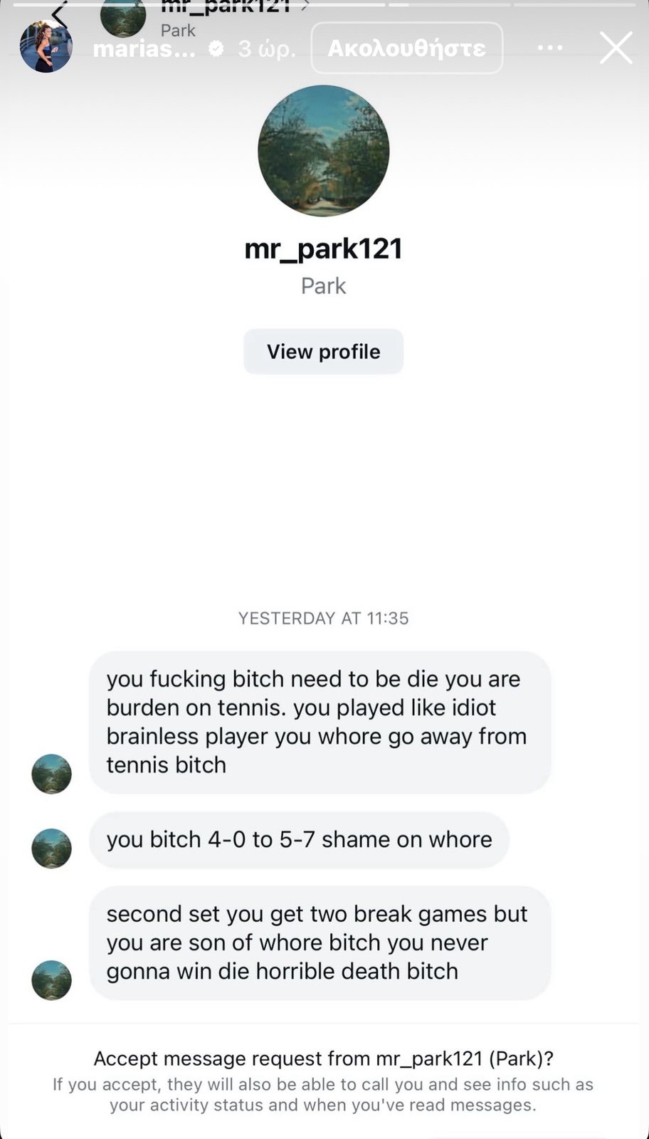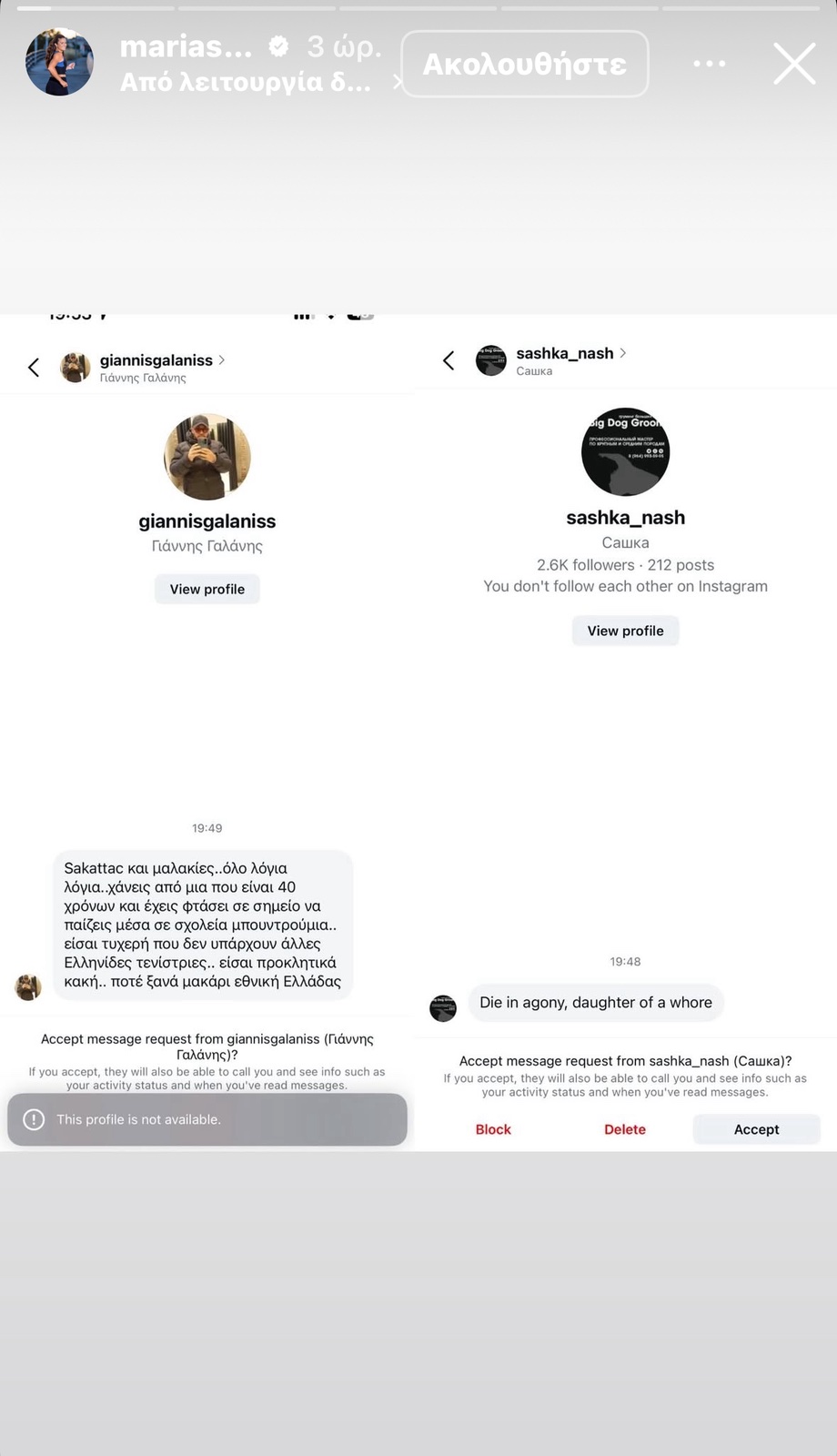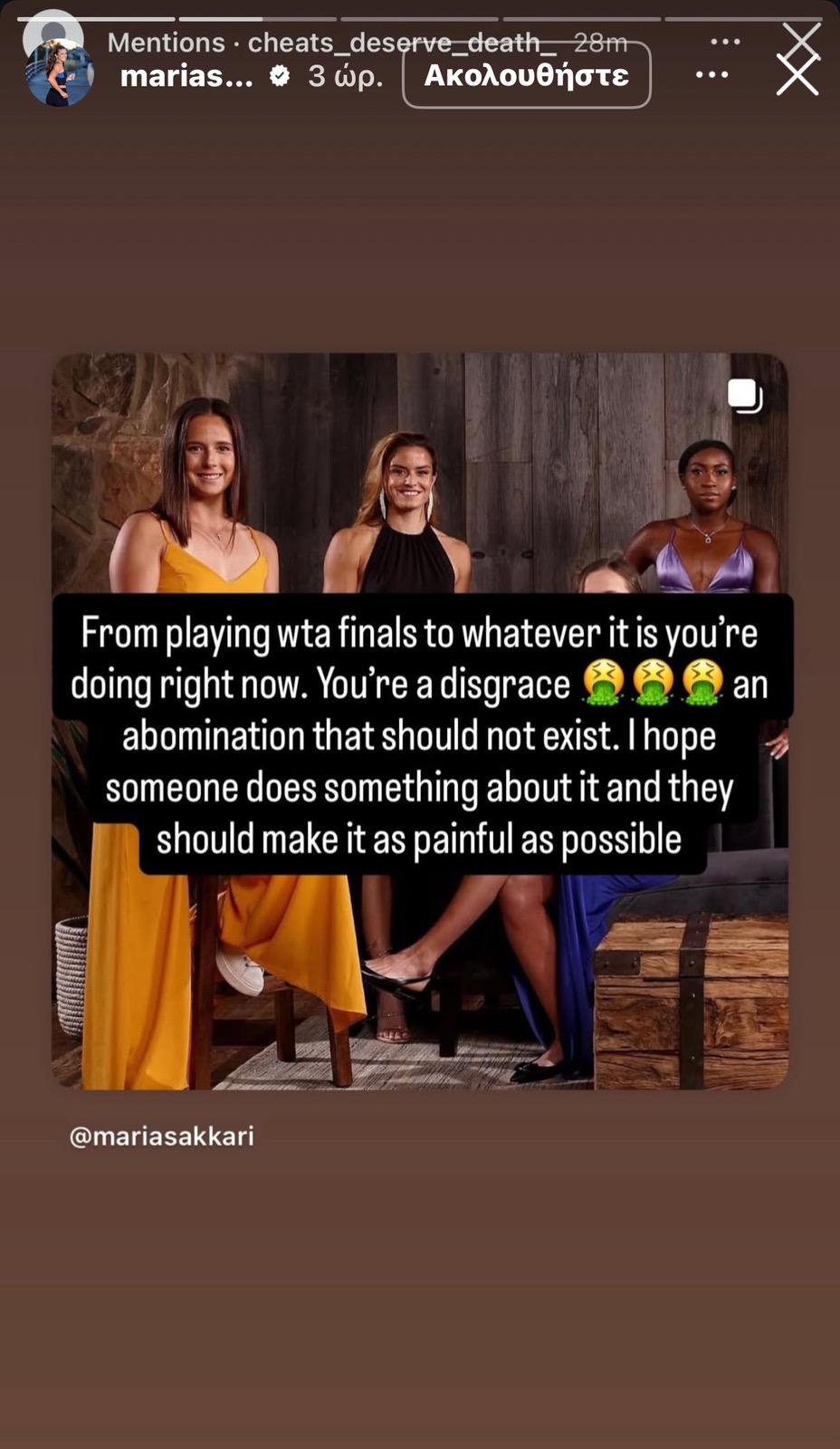 Η Μαρία Σάκκαρη, μετά από μια χρονιά που δεν την βρήκε να πετυχαίνει τους στόχους της στα κορυφαία τουρνουά, δέχθηκε μια σειρά από υβριστικά και προσβλητικά σχόλια στα μέσα κοινωνικής δικτύωσης. Η κορυφαία Ελληνίδα τενίστρια δεν δίστασε να δημοσιεύσει τα μηνύματα αυτά, απαντώντας με ένα δυναμικό ξέσπασμα στον προσωπικό της λογαριασμό στο Instagram.