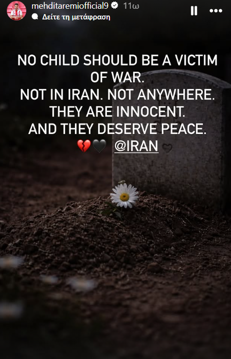 «Κανένα παιδί δεν θα έπρεπε να είναι θύμα πολέμου, ούτε στο Ιράν, ούτε οπουδήποτε. Είναι αθώοι. Τους αξίζει ειρήνη», ανέβασε χαρακτηριστικά ο Ιρανός επιθετικός στον προσωπικό του λογαριασμό στο Ίνσταγκραμ.