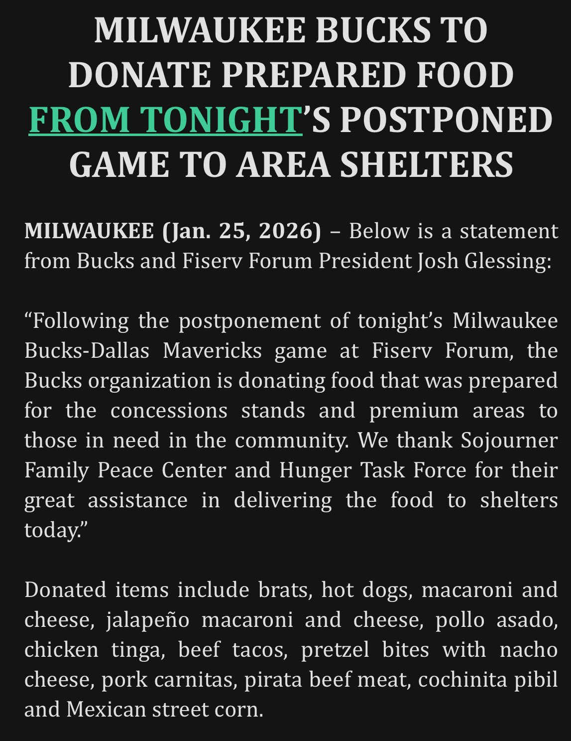 «Μετά την αναβολή του αποψινού αγώνα Milwaukee Bucks–Dallas Mavericks στο «Fiserv Forum», η ομάδα των Bucks δωρίζει το φαγητό που είχε ετοιμαστεί για τα κυλικεία και τους χώρους φιλοξενίας σε ανθρώπους που έχουν ανάγκη στην κοινότητα. Ευχαριστούμε το «Sojourner Family Peace Center» και το «Hunger Task Force» για τη σημαντική τους βοήθεια στη διανομή του φαγητού στα καταφύγια σήμερα. Τα είδη φαγητού που δωρίστηκαν περιλαμβάνουν: