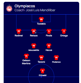 Στο τέρμα θα είναι ο Τζολάκης, με τους Ροντινέι, Ρέτσο, Πιρόλα και Ορτέγκα να είναι στην άμυνα. Οι Μουζακίτης και Έσε είναι στα χαφ με τους Ζέλσον Μάρτινς, Ταρέμι και Ποντένσε να είναι πίσω από τον Ελ Κααμπί.