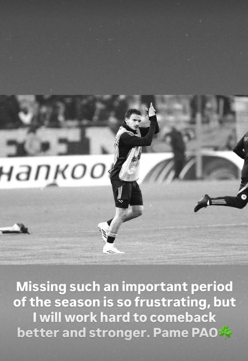 Ο ίδιος μέσω ανάρτησης στον προσωπικό λογαριασμό του στο Instagram, εξέφρασε τον αγανακτησμό του που θα χάσει ένα τόσο σημαντικό μέρος της σεζόν.