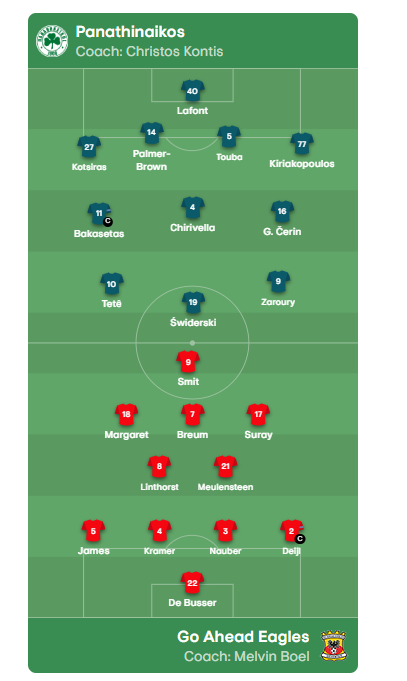 Ο τεχνικός του Παναθηναϊκού Χρήστος Κόντης θα παρατάξει το «τριφύλλι» με τους Λαφόν, Κυριακόπουλο, Τουμπά, Πάλμερ-Μπράουν, Κώτσιρα, Τσιριβέγια, Τσέριν, Μπακασέτα, Ζαρουρί, Τετέ και Σφιντέρσκι.