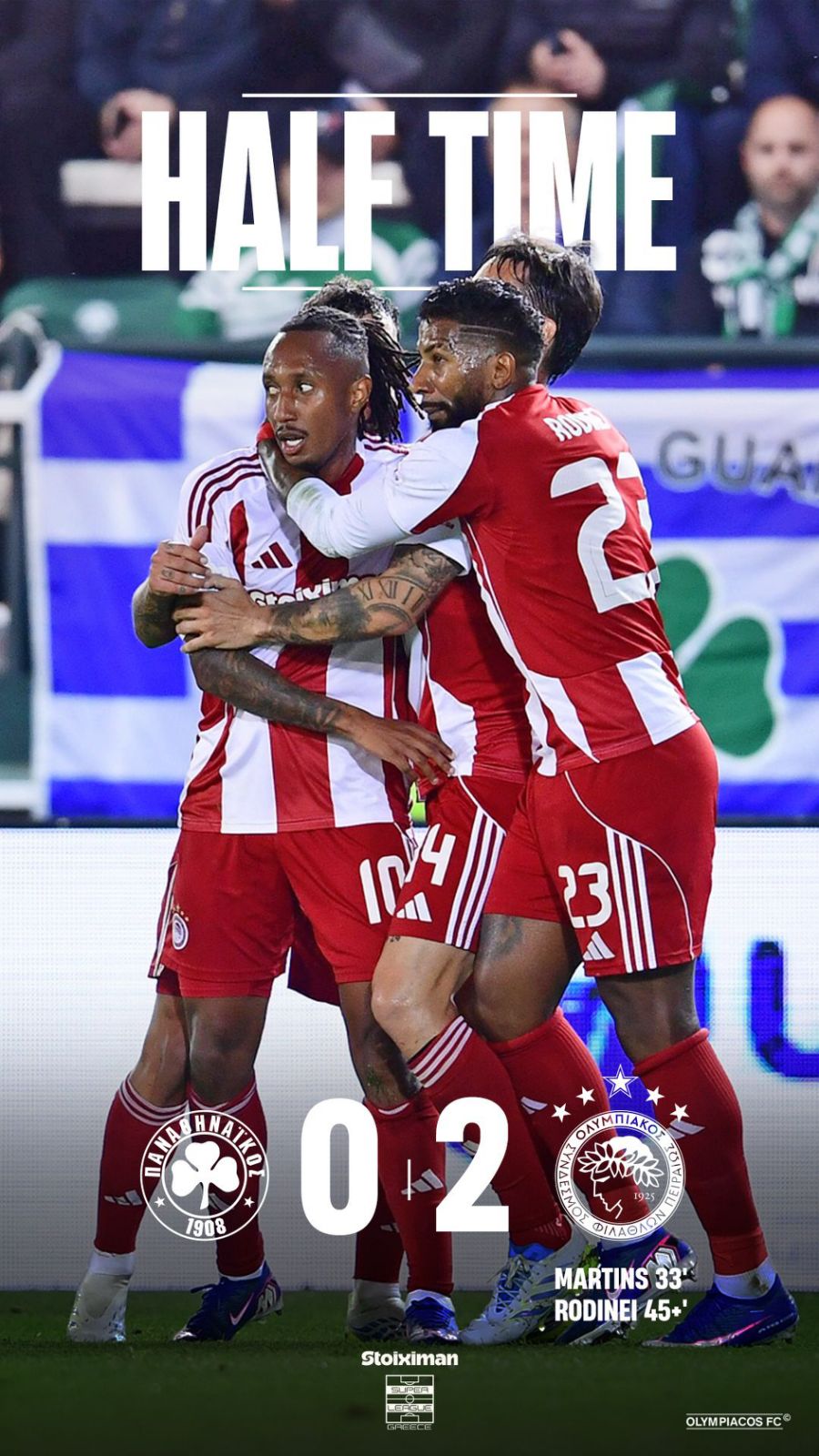 Ο Ολυμπιακός είναι ο απόλυτος κυρίαρχος στο πρώτο ημίχρονο του ντέρμπι με τον Παναθηναϊκό για την 2η αγωνιστική των playoffs της Super League.