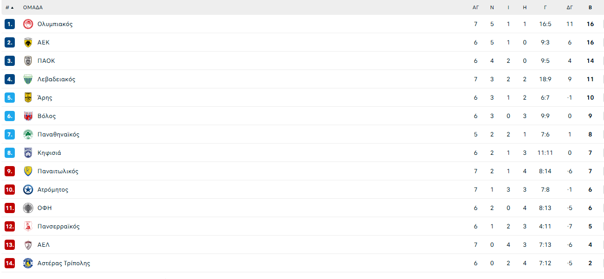 Οι «ερυθρόλευκοι» έφτασαν την ΑΕΚ στους 16 βαθμούς και περιμένουν το αυριανό ντέρμπι των «Δικέφαλων», ενώ οι «βυσσινί», στο ντεμπούτο του Στέλιου Μαλεζά στον πάγκο τους, έμειναν καθηλωμένοι στους 4 βαθμούς.