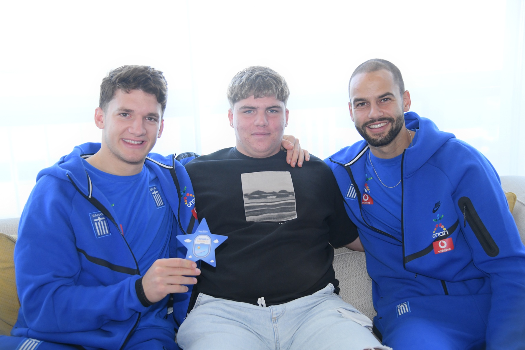 Οι τρεις φίλοι της «Γαλανόλευκης» είχαν προσκληθεί στο σημείο συνάντησης, χωρίς να γνωρίζουν ποια ήταν η έκπληξη που τους περίμενε. Τότε, οι Χρήστος Τζόλης, Ανδρέας Τετέι, Λάζαρος Ρότα και Δημήτρης Χατζηδιάκος εμφανίστηκαν μπροστά τους, κρατώντας τσάντες με δώρα, και κάθισαν δίπλα τους, με την έκπληξη να αποτυπώνεται απόλυτα στα πρόσωπα των παιδιών.