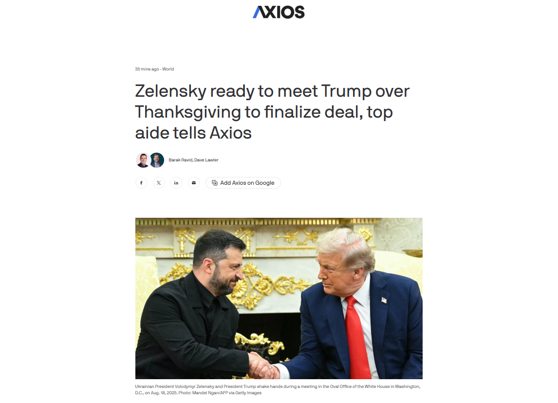 Έτοιμος να συναντηθεί με τον πρόεδρο των ΗΠΑ Ντόναλντ Τραμπ φαίνεται να είναι σύμφωνα με το Axios ο πρόεδρος της Ουκρανίας Βολοντίμιρ Ζελένσκι πιθανώς κατά την Ημέρα των Ευχαριστιών.