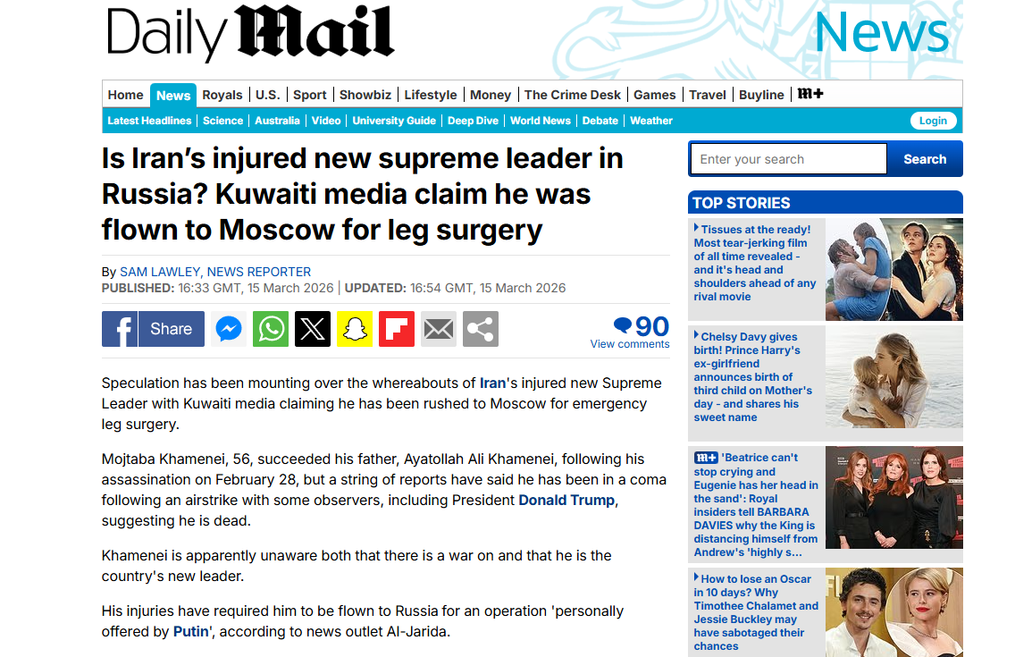 Daily Mail: «Ο Μοτζτάμπα Χαμενεΐ μεταφέρθηκε για χειρουργείο στη Ρωσία σύμφωνα με τα Μέσα Ενημέρωσης του Κουβέιτ»