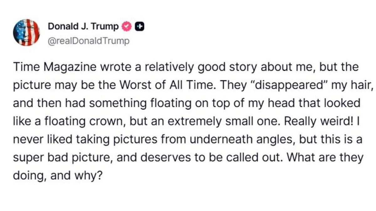 «Το Time Magazine έγραψε ένα σχετικά καλό κείμενο για μένα, αλλά η φωτογραφία ίσως είναι η χειρότερη όλων των εποχών», έγραψε ο Τραμπ στην πλατφόρμα του Truth Social τα ξημερώματα της Τρίτης.