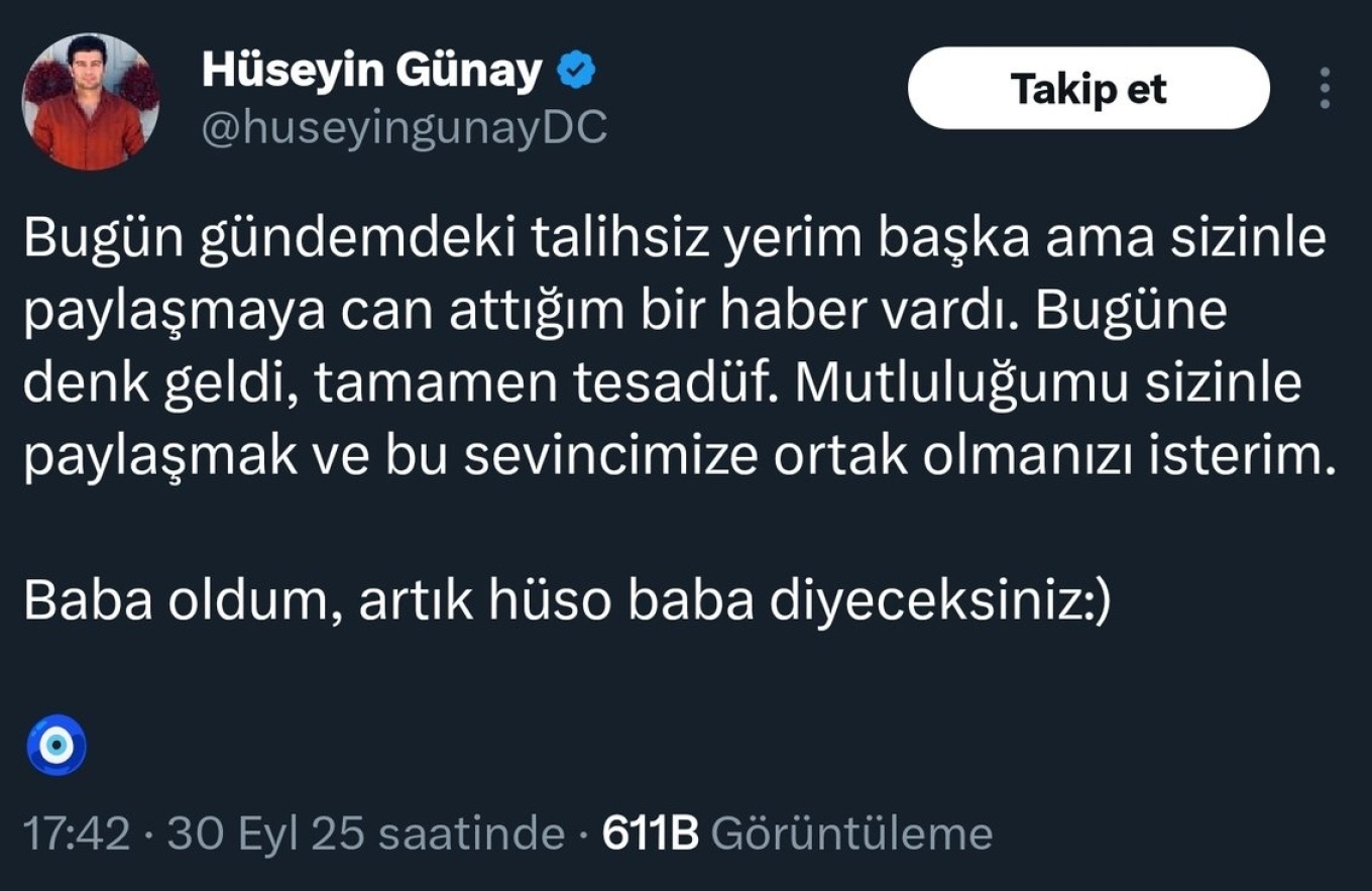 Η τελευταία ανάρτηση του Χουσεΐν Γκιουνάι πριν την απόλυση από το NTV – «Έγινα πατέρας»