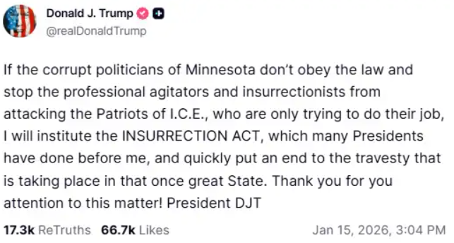 «Αν οι διεφθαρμένοι πολιτικοί της Μινεσότα δεν υπακούσουν στο νόμο και δεν σταματήσουν τους επαγγελματίες ταραχοποιούς και εξεγερμένους που επιτίθενται στους Πατριώτες της Υπηρεσίας Ελέγχου Μετανάστευσης, που προσπαθούν να κάνουν μόνο τη δουλειά τους, θα εφαρμόσω το ΝΟΜΟ ΠΕΡΙ ΕΞΕΓΕΡΣΗΣ», έγραψε ο Τραμπ την Πέμπτη, σε μία ανάρτησή του στο Truth Social.