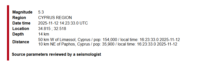 Να θυμίσουμε, ότι το μεσημέρι της Τετάρτης 12/11 σημειώθηκε σεισμός 5,1 Ρίχτερ στην Κύπρο, με το επίκεντρο να είναι στα 14χλμ βορειανατολικά της Πάφου και το εστιακό βάθος υπολογίζεται σε 17χλμ.