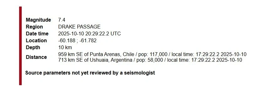 Την Παρασκευή το βράδυ (10/10) σημειώθηκε ισχυρός σεισμός 7,4 Ρίχτερ στον πορθμό του Ντρέικ, στη Χιλή.