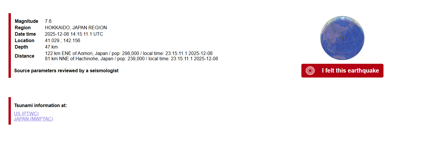 Breaking: Tsunami warning issued for parts of Northern Japan after magnitude 7.6 earthquake strikes off the coast. pic.twitter.com/HRf6yCUk3g— PM Breaking News (@PMBreakingNews) December 8, 2025