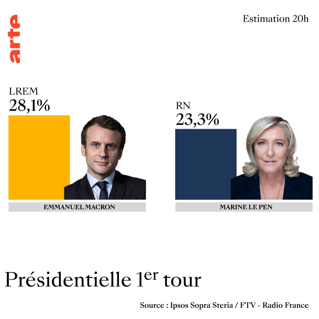 Σύμφωνα με τις εκτιμήσεις της εφημερίδας Le Monde ο Εμανουέλ Μακρόν συγκεντρώνει το 28,1% των ψήφων έναντι 23,3% της Μαρίν Λεπέν. Την τρίτη θέση καταλαμβάνει ο Ζαν Λικ Μελανσόν με 20,1%.