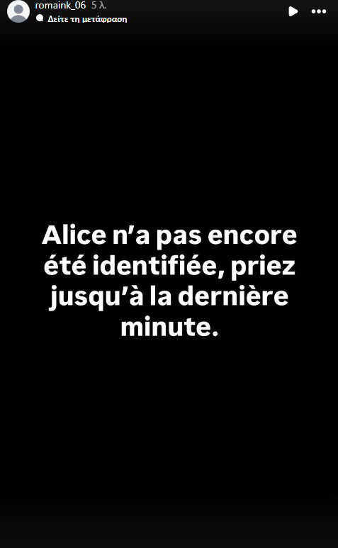 O αδερφός της ωστόσο με ανάρτησή του διέψευσε αυτές τις πληροφορίες. «Η Αλίκη δεν έχει ακόμη ταυτοποιηθεί, προσευχηθείτε μέχρι το τελευταίο λεπτό» έγραψε.