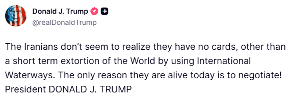«Οι Ιρανοί δεν φαίνεται να συνειδητοποιούν ότι δεν έχουν κανένα χαρτί, εκτός από έναν βραχυπρόθεσμο εκβιασμό του κόσμου χρησιμοποιώντας τις Διεθνείς Πλωτές Οδούς», έγραψε σε ανάρτησή του στην πλατφόρμα του Truth Social για να προσθέσει ότι «ο[ μόνος λόγος που είναι ζωντανοί σήμερα είναι για να διαπραγματεύονται!».