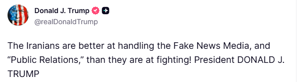 Μόλις ένα λεπτό νωρίτερα, ο Τραμπ είχε δημοσιεύσει ένα διαφορετικό μήνυμα, λέγοντας ότι το Ιράν ήταν καλύτερο στις «δημόσιες σχέσεις» παρά στις «μάχες».