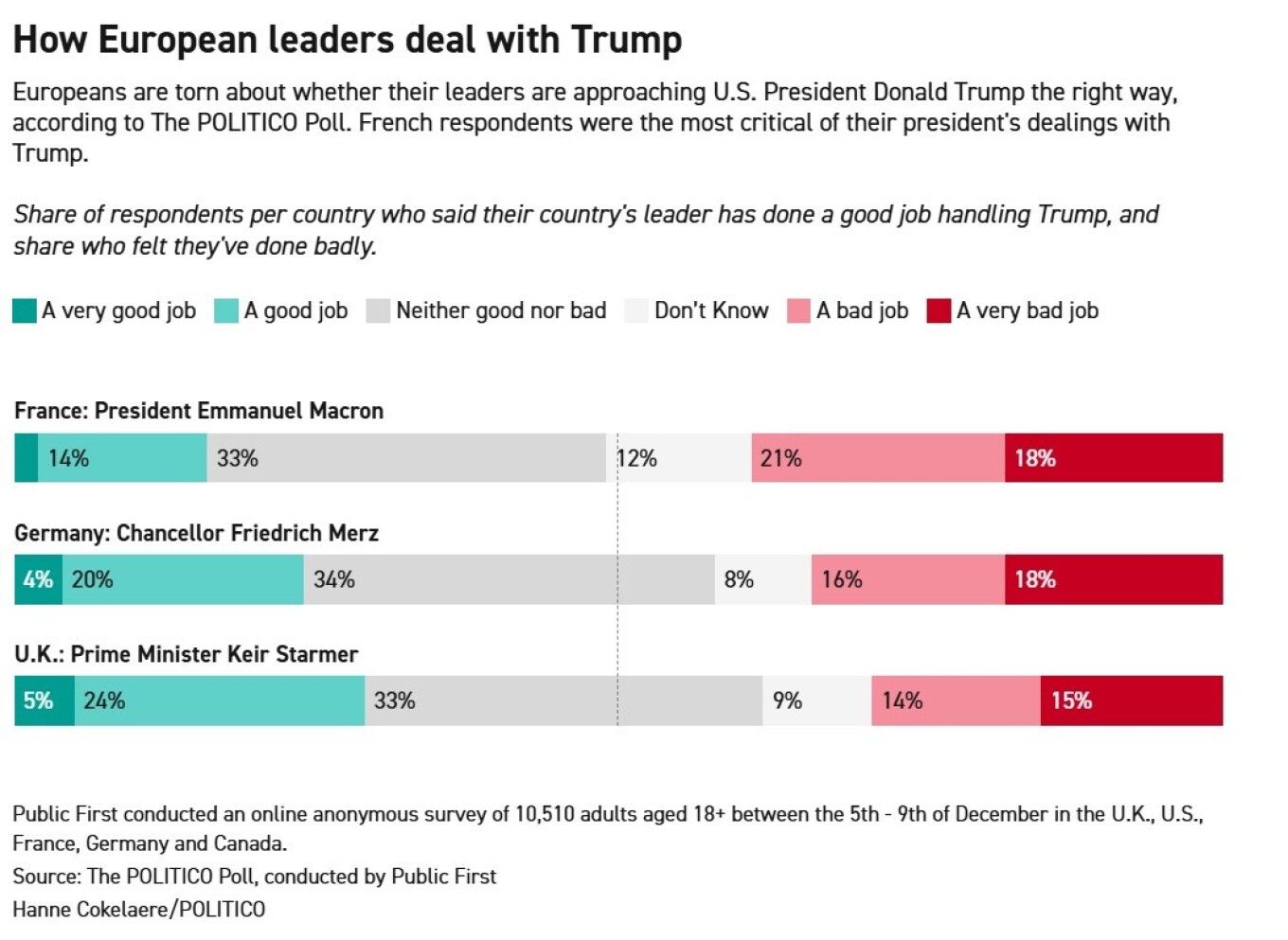 Για ηγέτες όπως ο Γερμανός καγκελάριος Φρίντριχ Μερτς και ο Γάλλος πρόεδρος Εμανουέλ Μακρόν, τα αποτελέσματα είναι ιδιαίτερα απογοητευτικά: οι δικοί τους ψηφοφόροι θεωρούν ότι μέχρι στιγμής έχουν αποτύχει σε μεγάλο βαθμό να χειριστούν αποτελεσματικά τον απρόβλεπτο Αμερικανό πρόεδρο.