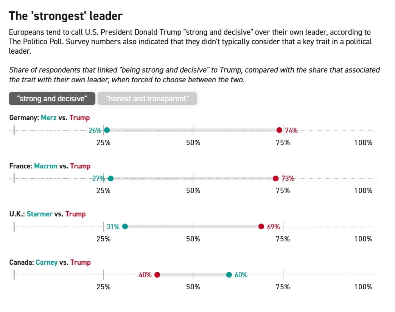 Οι ερευνητές διαπίστωσαν ότι οι Ευρωπαίοι γενικώς συμμερίζονται την άποψη του Τραμπ ότι οι ηγέτες τους είναι αδύναμοι, τουλάχιστον σε σύγκριση με τον ίδιο. Τον αξιολόγησαν ως πιο «ισχυρό και αποφασιστικό» από τους δικούς τους ηγέτες, με ποσοστά 74% έναντι 26% στη Γερμανία· 73% έναντι 27% στη Γαλλία· και 69% έναντι 31% στο Ηνωμένο Βασίλειο. Ο Καναδάς ήταν και πάλι η εξαίρεση: το 60% θεωρεί τον Κάρνεϊ ισχυρότερο και πιο αποφασιστικό από τον Τραμπ, και μόλις 40% το αντίστροφο.