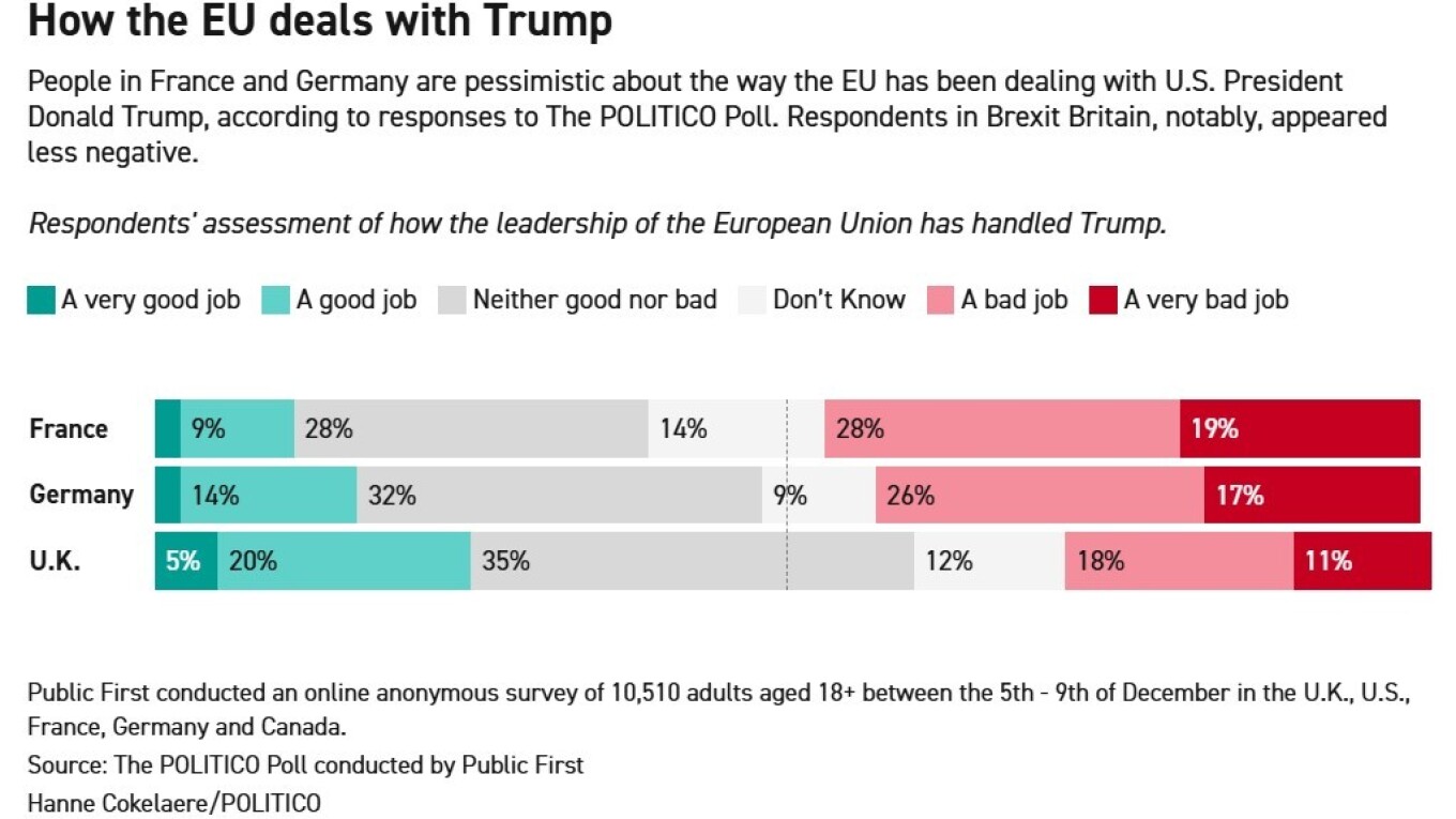 Οι ηγέτες της ΕΕ έλαβαν τις χειρότερες βαθμολογίες. Στη Γαλλία, μόνο το 11% θεωρεί ότι οι Βρυξέλλες έχουν χειριστεί καλά τον Τραμπ, ενώ το 47% δηλώνει ότι η ηγεσία της ΕΕ έχει διαχειριστεί άσχημα τη σχέση με τον επικεφαλής του Λευκού Οίκου.