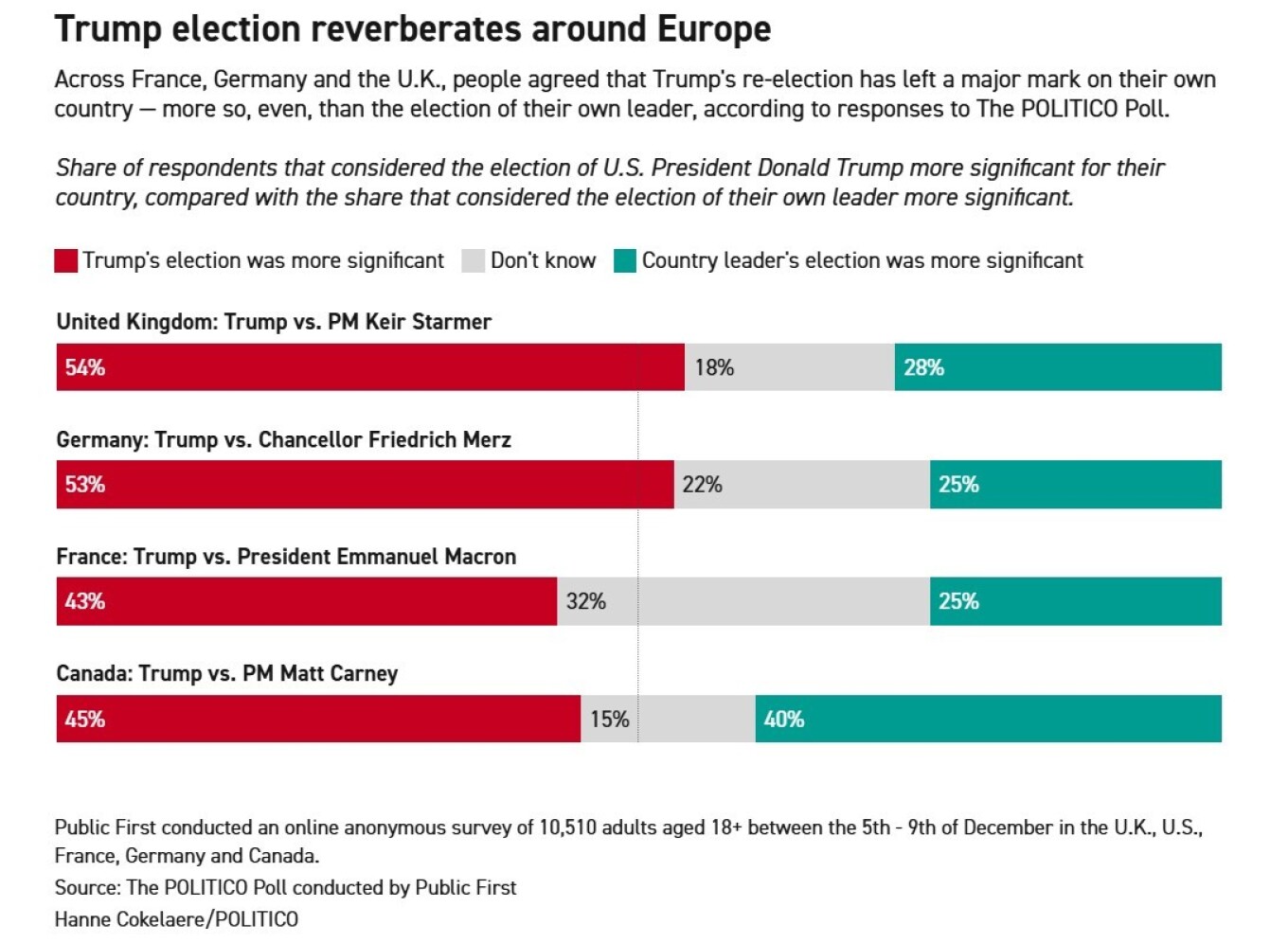 Η έρευνα διαπίστωσε ότι στη Γερμανία και το Ηνωμένο Βασίλειο περισσότεροι από τους μισούς ερωτηθέντες θεωρούν την εκλογή του Τραμπ ακόμη πιο σημαντική από τις εκλογές των δικών τους ηγετών – παρότι τόσο ο Μερτς όσο και ο Στάρμερ έχουν ανέλθει σχετικά πρόσφατα στην εξουσία.