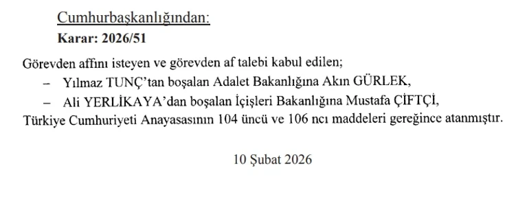 Σύμφωνα με προεδρικά διατάγματα που δημοσιεύθηκαν στην Εφημερίδα της Κυβέρνησης, ο Μουσταφά Τσιφτσί, Κυβερνήτης του Ερζερούμ, διορίστηκε Υπουργός Εσωτερικών και ο Ακίν Γκιουρλέκ, Γενικός Εισαγγελέας της Κωνσταντινούπολης, διορίστηκε Υπουργός Δικαιοσύνης.