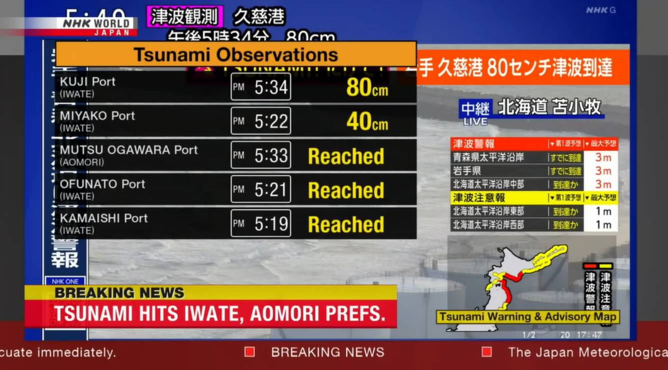 Τσουνάμι ύψους έως και 3 μέτρων αναμένεται να φθάσει στην επαρχία Ιγουάτε του νησιού Χονσού και σε περιοχές του Χοκάιντο, σύμφωνα με την ειδοποίηση που εκδόθηκε. Τα πρώτα κύματα τσουνάμι έφθασαν άμεσα στις βόρειες ακτές της Ιαπωνίας, σύμφωνα με την Μετεωρολογική Υπηρεσία που προειδοποιεί ότι αναμένονται καταστροφές.