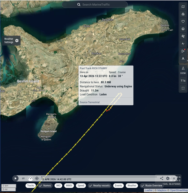 Το Rich Starry, ένα πλοίο φορτωμένο με πετρέλαιο που είχε δηλώσει ότι προορισμός του ήταν η Κίνα, επέστρεψε από το Στενό περίπου 20 λεπτά μετά την έναρξη του αποκλεισμού, σύμφωνα με την MarineTraffic, μια εταιρεία ναυτιλιακών αναλύσεων.