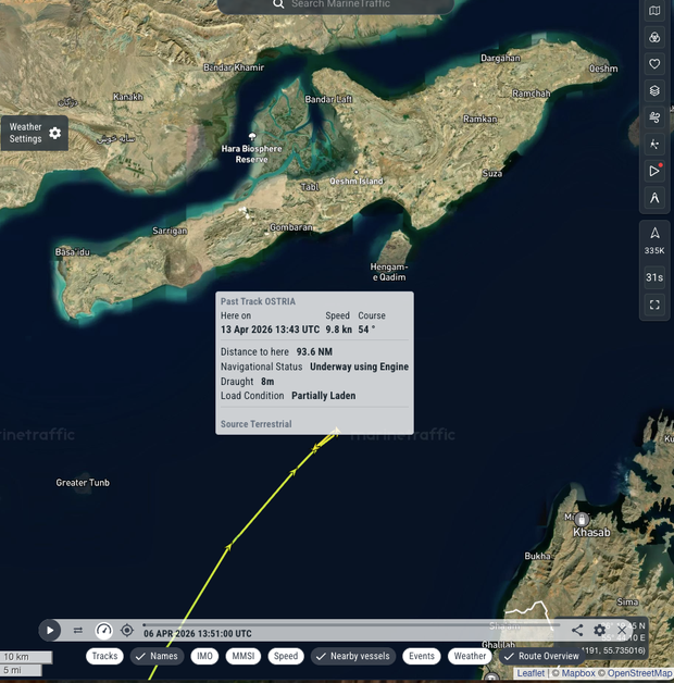 Εν τω μεταξύ, το Ostria, ένα κινεζικό δεξαμενόπλοιο πετρελαίου/χημικών με ψευδή σημαία που ήταν μερικώς φορτωμένο με πετρέλαιο, επέστρεψε από το Στενό, σύμφωνα με το MarineTraffic. Το πλοίο πλέει υπό τη σημαία της Μποτσουάνα, μιας αφρικανικής χώρας χωρίς σύνορα.