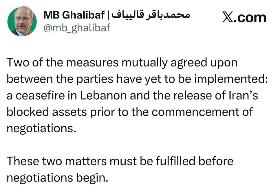«Δύο από τα μέτρα που συμφωνήθηκαν αμοιβαία μεταξύ των μερών δεν έχουν ακόμη εφαρμοστεί: η κατάπαυση του πυρός στον Λίβανο και η αποδέσμευση των δεσμευμένων περιουσιακών στοιχείων του Ιράν πριν από την έναρξη των διαπραγματεύσεων», έγραψε ο Γκαλιμπάφ σε μια ανάρτηση στο X για να προσθέσει: «Αυτά τα δύο ζητήματα πρέπει να εκπληρωθούν πριν από την έναρξη των διαπραγματεύσεων».