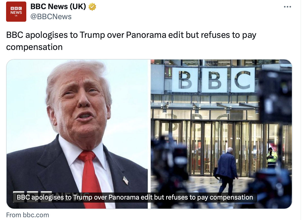 Το BBC επιβεβαίωσε απόψε πως ζήτησε επίσημα συγγνώμη από τον Αμερικανό πρόεδρο για το ντοκιμαντέρ «Τραμπ: Μια Δεύτερη Ευκαιρία;» («Trump: A Second Chance?») που προβλήθηκε από την εκπομπή Panorama τον Οκτώβριο του 2024. Το βρετανικό ραδιοτηλεοπτικό δίκτυο δεσμεύεται ότι δεν θα ξαναπροβάλει το εν λόγω πρόγραμμα σε καμία από τις πλατφόρμες του, αλλά αρνείται να καταβάλει αποζημίωση.