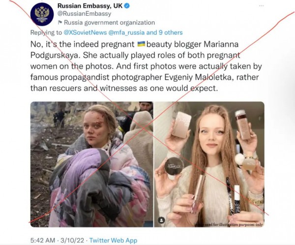Η Ρωσική πρεσβεία του Ηνωμένου Βασιλείου πήγε τα πράγματα ένα βήμα παρακάτω, ανεβάζοντας μάλιστα εικόνες από τον βομβαρδισμό, υποστηρίζοντας πως οι γυναίκες έγκυες που απεικονίζονται είναι στην πραγματικότητα ηθοποιοί και τους χρήστες του twitter να εξαγριώνονται.