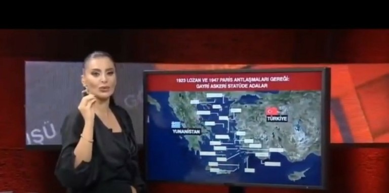 Έτσι μετά το προκλητικό κρεσέντο του Μεβλούτ Τσαβούσογλου, όσον αφορά τα ελληνοτουρκικά όπου με χάρτες “γκρίζρε” σχεδόν όλο το Αιγαίο, τη “σκυτάλη” πήρε η δημοσιογράφος του CNN Turk Χαντέ Φιράτ, που έδειξε έναν παρόμοιο χάρτη με τα ελληνικά νησιά, των οποίων η Τουρκία αμφισβητεί την κυριαρχία, ενώ έκανε αναφορά και στις βάσεις των ΗΠΑ στην Αλεξανδρούπολη και στην Κρήτη.