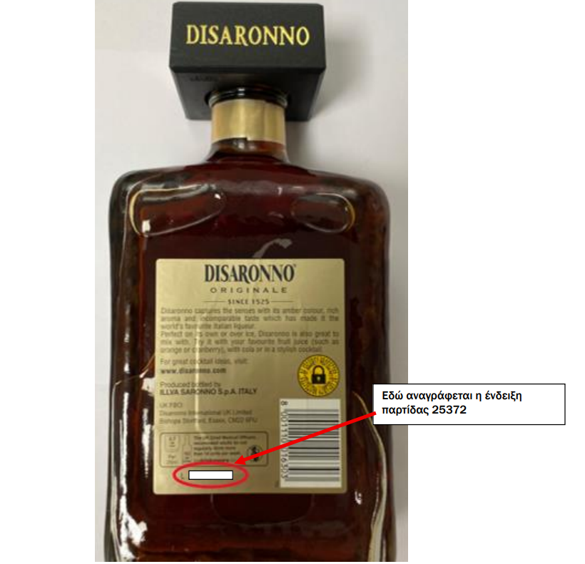 Στην ανάκληση συγκεκριμένης παρτίδας του λικέρ DISARONNO προχωρά η Γενική Διεύθυνση του Γενικού Χημείου του Κράτους (ΓΔ ΓΧΚ) της ΑΑΔΕ, σε συνέχεια ενημέρωσης που έλαβε από εταιρεία διακίνησης αλκοολούχων ποτών σχετικά με την πιθανή παρουσία θραυσμάτων γυαλιού.