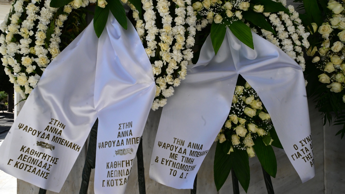 Στεφάνια έστειλαν, μεταξύ άλλων, ο πρωθυπουργός Κυριάκος Μητσοτάκης και η υπουργός Πολιτισμού Λίνα Μενδώνη.