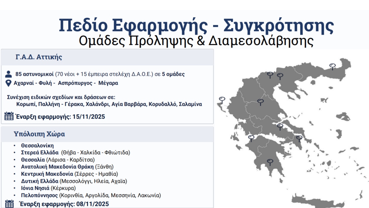 Η εφαρμογή του σχεδίου αστυνόμευσης ξεκινά από την περιφέρεια αύριο, Σάββατο 8 Νοεμβρίου 2025 και από τις 15 Νοεμβρίου στους οικισμούς της Αττικής, πάντα με στόχο την αντιμετώπιση της εγκληματικότητας και την εξασφάλιση της κοινωνικής ειρήνης στις περιοχές αυτές, όπου καταγράφεται υψηλή παραβατικότητα.